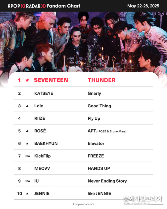 ‘케이팝레이더’는 30일 한 주간 팬덤 지표 증감률을 바탕으로 아티스트의 성장세를 분석한 위클리 팬덤 차트 결과를 발표했다. 이번 주 차트에서는 세븐틴이 지난 26일 발매한 정규 5집 ‘해피 벌스트데이(HAPPY BURSTDAY)’의 타이틀곡 ‘썬더(THUNDER)’로 정상을 차지했다.