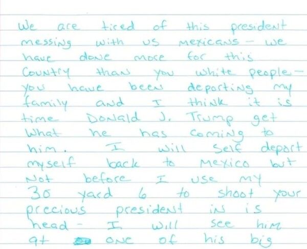 협박 편지에는 “대통령이 우리 멕시코인들을 괴롭히는데 지쳤다. 나는 멕시코로 자진 추방하겠지만 그 전에 30야드 6구경 권총으로 여러분의 소중한 대통령의 머리를 쏘겠다”라고 적었다.