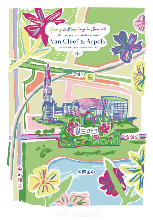 반클리프 아펠이 탄생한 1906년 이래, 메종에게 자연은 끝없는 영감의 원천이자 경외의 대상이었다. 지난 2014년부터 매년 봄의 시작을 기념하며 계절 고유의 활기찬 생명력을 전해온 반클리프 아펠이 또 한 번 새로운. 이벤트를 선보인다. 뉴욕, 도쿄, 상하이, 홍콩을 거쳐 국내 처음 상륙을 앞둔 ‘스프링 이즈 블루밍(Spring is Blooming)’은 활기차고 긍정적인 무드로 가득한 예술 세계를 펼치는 아티스트 알렉상드르 뱅자맹 나베와의 파트너십으로 완성된다. 그가 거대한 캔버스로 삼은 곳은 바로 잠실 롯데월드타워 월드파크. 활짝 핀 꽃으로 장식한 아치, 여유로운 시간을 보낼 수 있는 파고라, 광장에 자리한 분수 등 메종의 방대한 유산 및 아카이브를 기반으로 완성한 다채로운 오브제가 마치 동심으로 돌아간 듯한 분위기를 선사한다.