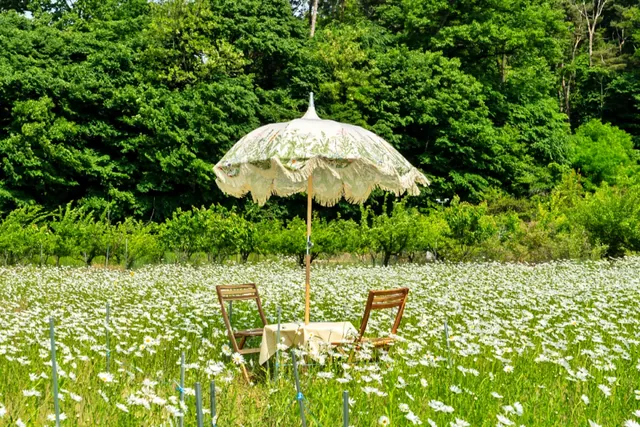 8000평의 대형 카페로, 초여름의 샤스타데이지와 파라솔이 어우러져 피크닉 분위기를 제공합니다. 계절마다 다른 꽃 테마로 방문객을 맞이합니다.