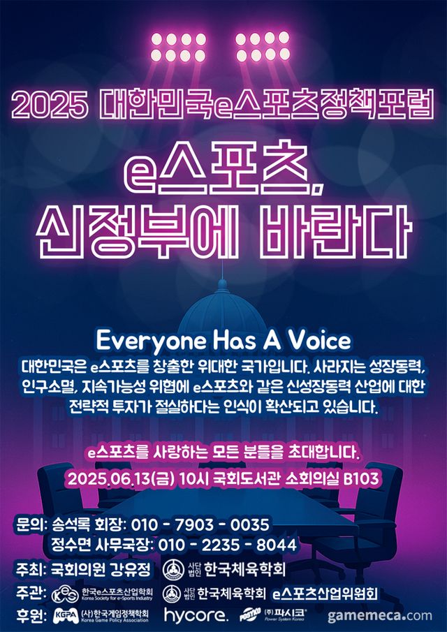 오는 6월 13일 오전 10시, 국회도서관 소회의실에서 2025 대한민국 e스포츠 정책포럼 – e스포츠, 신정부에 바란다'가 개최된다.