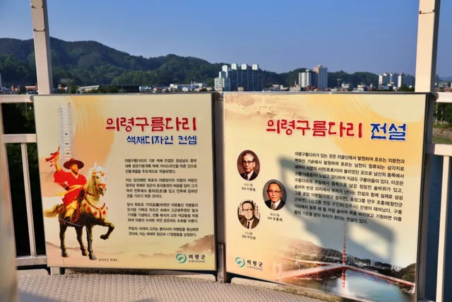 다리의 주탑에는 18개의 흰색 고리가 있는데, 이는 곽재우 장군과 함께한 17명의 장수를 기리는 것이라고 합니다. 또한, 주탑 주변에는 의령의 9가지 경관에 대한 정보를 제공하여, 다른 명소를 탐방하는 재미도 있습니다.