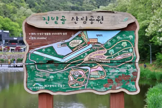 진밭골산림공원은 범물동 산 191번지에 위치해 있으며, 대구 수성구의 유명한 녹지 공간 중 하나입니다. 이곳은 산책과 운동, 그리고 피크닉을 모두 즐길 수 있는 최고의 힐링 장소로, 대덕지라는 저수지가 중심을 이루고 있습니다. 주변에는 철쭉 군락지, 다양한 운동시설, 육각정자, 벚나무길, 그리고 전망대가 자연스럽게 연결되어 있어 방문객들에게 여유로운 산책을 제공합니다.