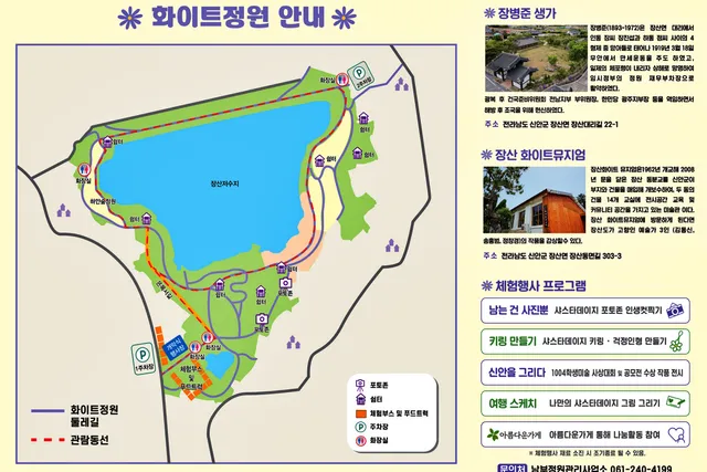 축제가 열리는 화이트정원은 장산면의 대표적인 숲 정원으로, 샤스타데이지 꽃길이 저수지를 따라 길게 이어져 있어 산책만으로도 봄의 향기를 물씬 느낄 수 있다. 완만하게 조성된 산책로 덕분에 가족, 연인, 친구들이 함께 편하게 방문할 수 있다.