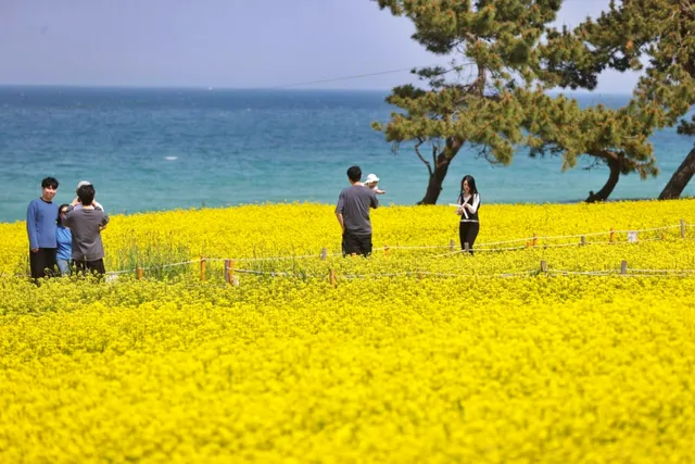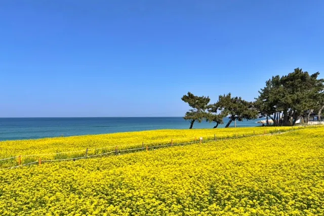 맑은 하늘 아래 유채꽃밭을 거닐다 보면 주변의 이국적인 풍경은 물론 취향에 맞는 인생 사진을 찍기에 충분합니다. 특히 꽃밭 아래 파스텔톤으로 칠해진 ‘무지개 방파제’는 SNS에서 큰 인기를 끌고 있는 명소입니다.