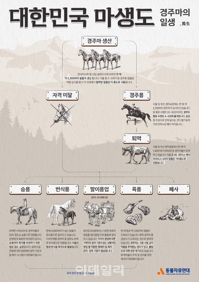경주마가 되지 못한 다수의 말들은 관상용이나 승마용으로 살게 됩니다. 또 경주마들이 늙어 퇴역하게 될 경우 승용마 등으로 전환되지 못하면, 방치되거나 도축되는 사례가 빈번합니다. 2022년 한 해에만 제주에서 1327마리의 경주마가 퇴역했지만, 이 중 34.7%가 폐사, 18.1%가 도축됐습니다. 최근에는 무허가 농장에서 방치돼 굶어 죽거나 불법 도살된 퇴역마들이 발견되기도 해 논란이 되기도 했습니다.