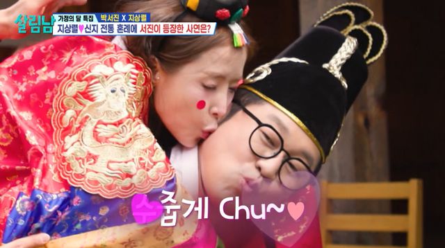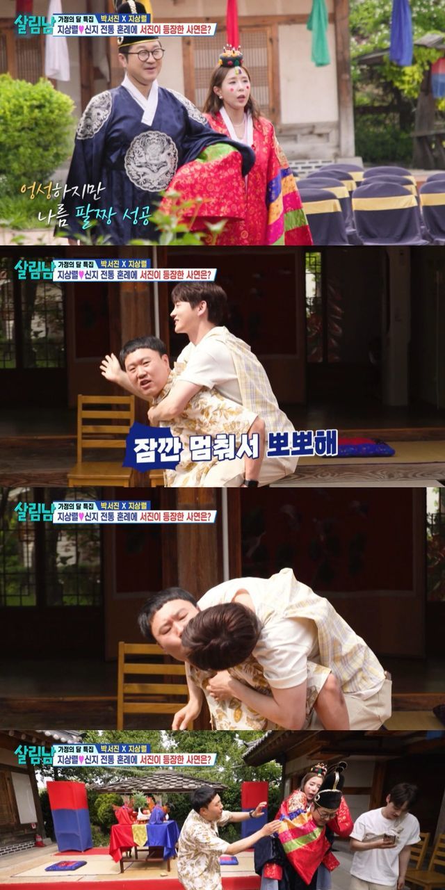 박력있는 지상렬의 팔짱 리드에 따른 신지는 전통 혼례식의 꽃 어부바 위에서 뽀뽀를 요구받았다.