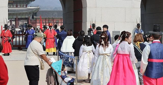 서울 경복궁을 찾은 외국인 관광객들이 한복을 입고 걷고 있다. / 연합뉴스