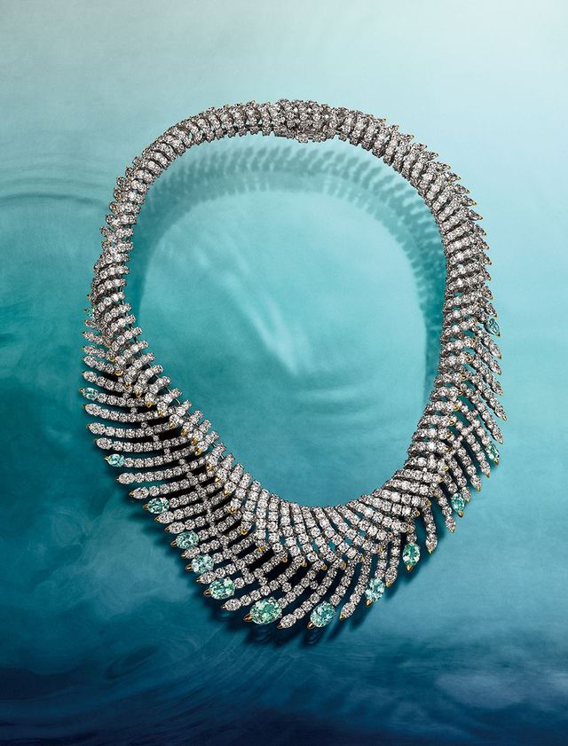 」해양 식물에서 모티브를 따온 오션 플로라는 씨 오브 원더 컬렉션의 대표 테마 중 하나다. 네크리스, 링, 이어링 등 다양한 형태로 구현되었는데, 그중 특히 돋보이는 것은 10캐럿이 넘는 에메랄드와 다이아몬드로 세팅한 네크리스. 깊이 있고 생동감 넘치는 컬러의 잠비아산 에메랄드가 다이아몬드 정원 위에 떠 있는 듯한 인상을 준다.