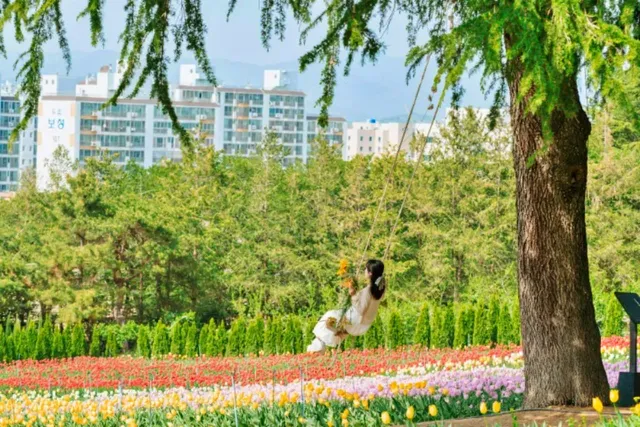 튤립 정원 외에도 ‘튤립 그네 포토존’은 SNS에서 인기가 높은 명소로, 그네를 둘러싼 튤립이 로맨틱한 분위기를 선사합니다.