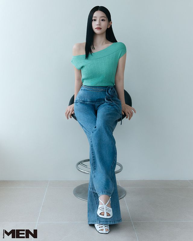 오프숄더로도 연출할 수 있는 보트넥 니트 톱과 플라워 체인 벨트가 돋보이는 와이드 데님 팬츠, 키튼 힐 슈즈 모두 Mine.