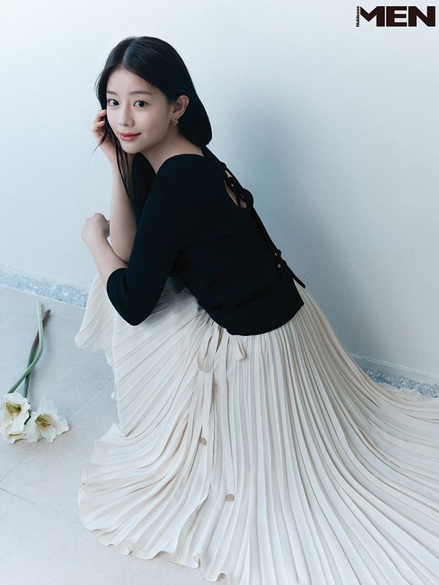 하트 모양 컷아웃과 리본 장식의 블랙 니트 톱, 비대칭 실루엣의 랩 플리츠스커트 모두 Mine, 이어링 스타일리스트 소장품.
