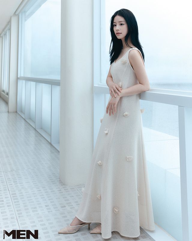 은은한 반짝임의 니트 크로셰 카디건과 화이트 데님 쇼츠 모두 Mine, 이어링 스타일리스트 소장품.
