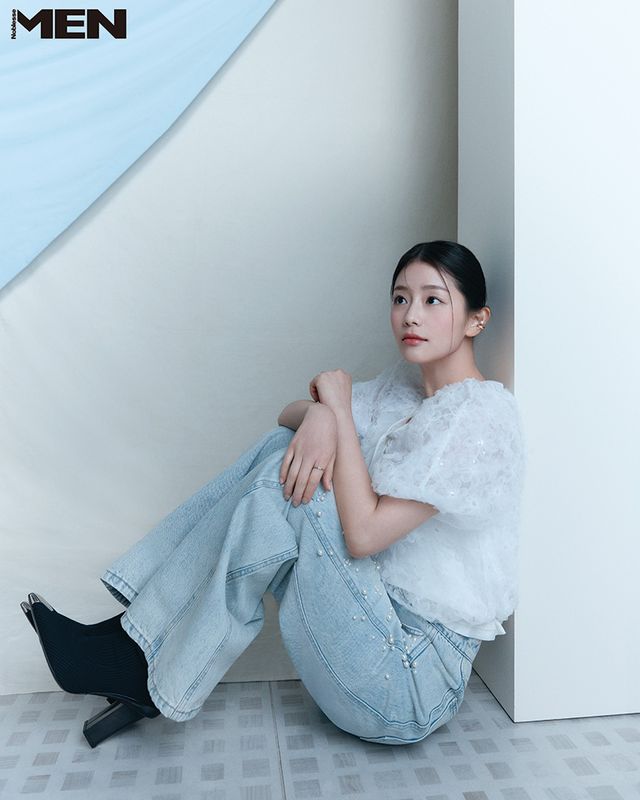 입체적 플라워 아플리케와 시퀸 장식의 크롭트 톱, 볼드한 진주 장식 워싱 데님 팬츠 모두 Mine, 슈즈와 이어링, 링 스타일리스트 소장품.