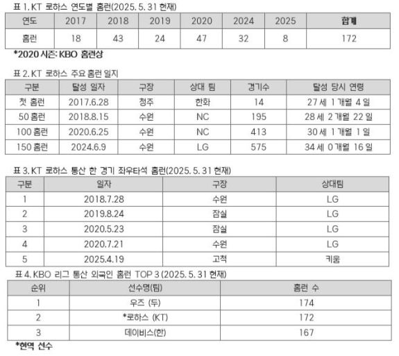KBO는 '로하스는 데뷔 시즌을 제외하고 매년 20홈런 이상을 기록하며 지난해 리그 역대 27번째 4시즌 연속 20홈런을 달성했다. 이번 시즌에는 리그 역대 13명만 기록한 5시즌 연속 20홈런에 도전하고 있다'라고 부연했다. 외국인 타자 중에서 이 기록을 해낸 건 우즈와 제이미 로맥(전 SSG 랜더스) 둘 뿐이다. 스위치 타자인 로하스는 한 경기 좌·우타석에서 모두 홈런을 때려낸 것도 다섯 번이나 된다.