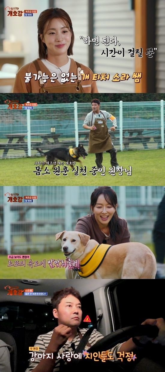 1일 방송된 JTBC 새 예능 '집 나가면 개호강'에서는 강소라와 아이브 레이가 함께하는 중소형견 반, 조한선과 박선영이 함께하는 대형견 반 원생들이 입장했다.