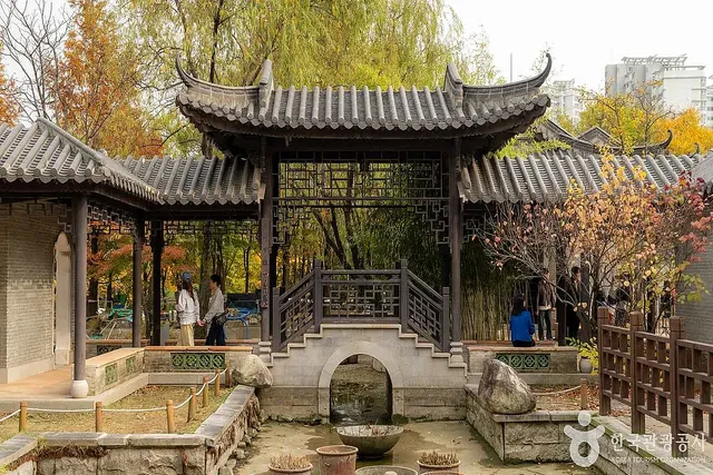 수원 효원공원의 월화원은 중국 광둥성의 전통 정원을 재현했습니다. 연못과 부용사 건물은 이국적인 매력을 풍기며 고대 중국을 연상케 합니다.