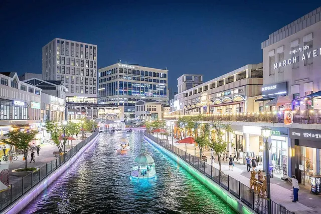 김포의 라베니체는 베네치아 스타일을 본뜬 인공수로와 그 주위의 풍경이 매력적인 곳입니다. 낮에는 산책을, 밤에는 로맨틱한 조명과 함께 여유로운 시간을 보낼 수 있습니다.