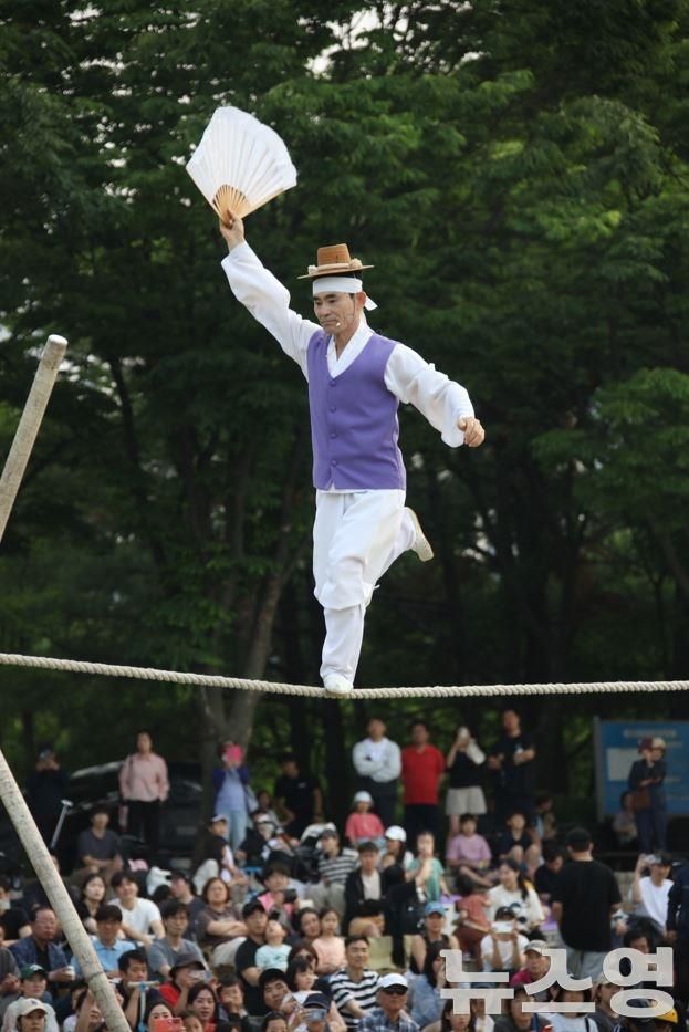 권원태 명인이 지난 5월 31일 평촌중앙공원에서 열린 안양단오제에서 줄타기 공연을 선보이고 있다./사진=안양시