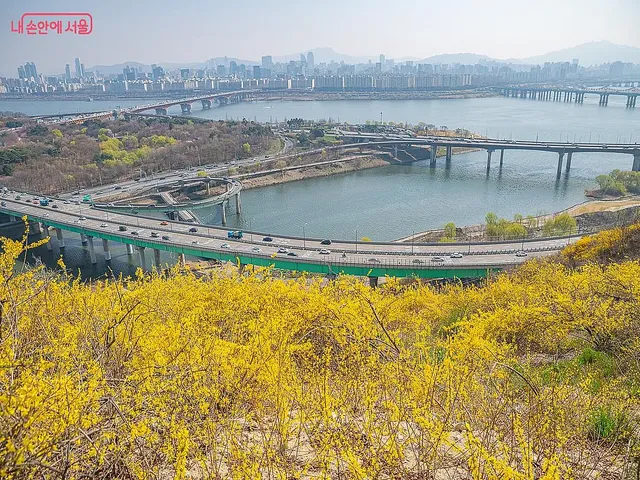응봉산은 서울숲 근처에 위치한 작은 바위산으로, 3월 말부터 노란 개나리꽃이 산을 뒤덮어 서울의 봄 기운을 가장 먼저 느낄 수 있는 장소로 인기를 끌고 있습니다. 경사가 완만해 가족들과 주말 산책을 하기 좋습니다.