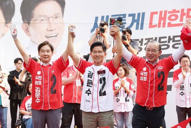 김문수 국민의힘 대통령 후보가 지난 1일 오후 서울 서대문구 신촌역 앞 집중유세에서 시민들에게 지지를 호소하고 있다 / 뉴스1