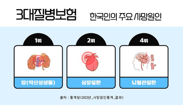 [와이뉴스] 한국인의 주요 사망원인중에 암, 뇌혈관질환, 심혈관질환은 흔히 3대질병이라 일컬어지며 살아가면서 가장 먼저 대비해야 하는 중대질병으로 항상 강조되고 있다. 이들 질병에 미리 대비하기 위해 가입하는 것이 진단비보험인데, 이러한 3대질병진단비를 중점으로 보장하는 보장성보험이 3대진단비보험 이다. 3대질병진단비보험은 각각의 질병에 주목해서 보장하기도 하지만, 나에게 맞는 추가 특약을 잘 골라서 가입한다면 종합건강보험으로도 충분히 활용도가 높다.