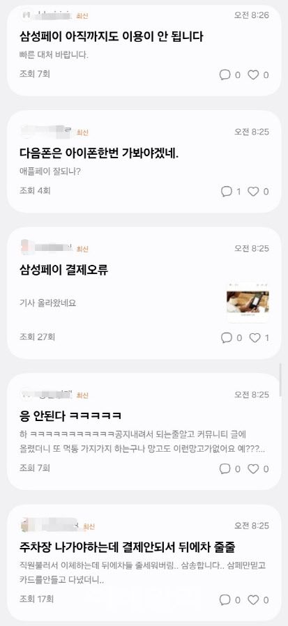 삼성멤버스 및 온라인 커뮤니티 등에서는 “편의점에서 계좌이체 했다”, “삼성페이가 안돼서 주차장 뒤차를 줄 세워버렸다”, “교통카드도 안돼서 버스도 못탔다”, “식당에서 결제가 안돼서 못 나가고 있다” 등의 이용자들의 피해 사례가 속출했다.