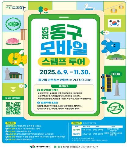 [한국미디어뉴스통신 박말희 기자] 대구 동구청은 관광객 유치를 위해 6월부터 11월까지 비대면 관광서비스 ‘동구네 놀러가자! 모바일 스탬프 투어’를 실시한다.