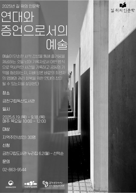 서영철 금천문화재단 대표이사는 “예술은 시대를 기록하고, 인문학은 삶을 성찰하게 하는 힘이 있다”며 “이번 인문학 강연을 통해 이웃과 연대하고, 나의 이야기를 찾는 뜻깊은 시간을 함께하길 바란다”라고 했다.