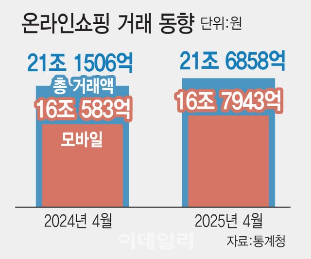 2일 통계청의 ‘2025년 4월 온라인쇼핑동향’에 따르면 지난 4월 기준 온라인 쇼핑 거래금액은 전년 동월 대비 2.5%(5352억원) 늘어난 21조 6858억원으로 집계됐다.