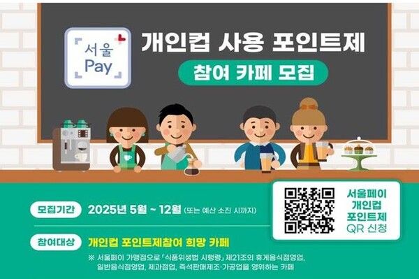 ‘서울페이 개인 컵 포인트제’는 시민이 참여 매장 카페에서 개인 컵을 이용해 음료를 구입할 경우, 매장 자체 할인(100원 이상)에 더해 서울시가 서울페이 포인트 300원을 추가로 적립해 주는 방식이다.