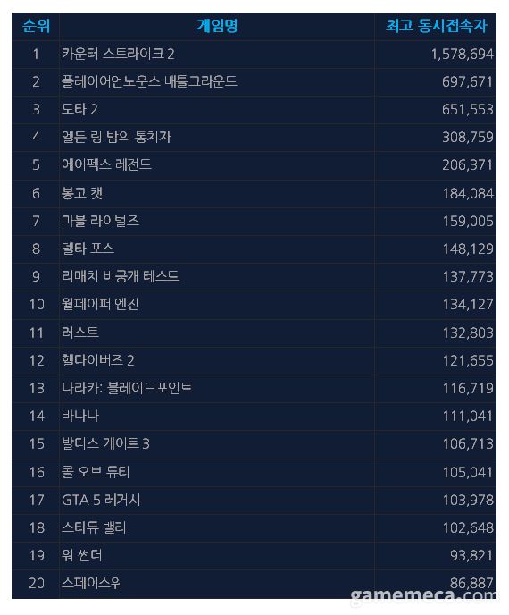 ▲ 6월 2일 정오 기준 스팀 일 최고 동시접속자 TOP 20 (자료출처: 스팀)