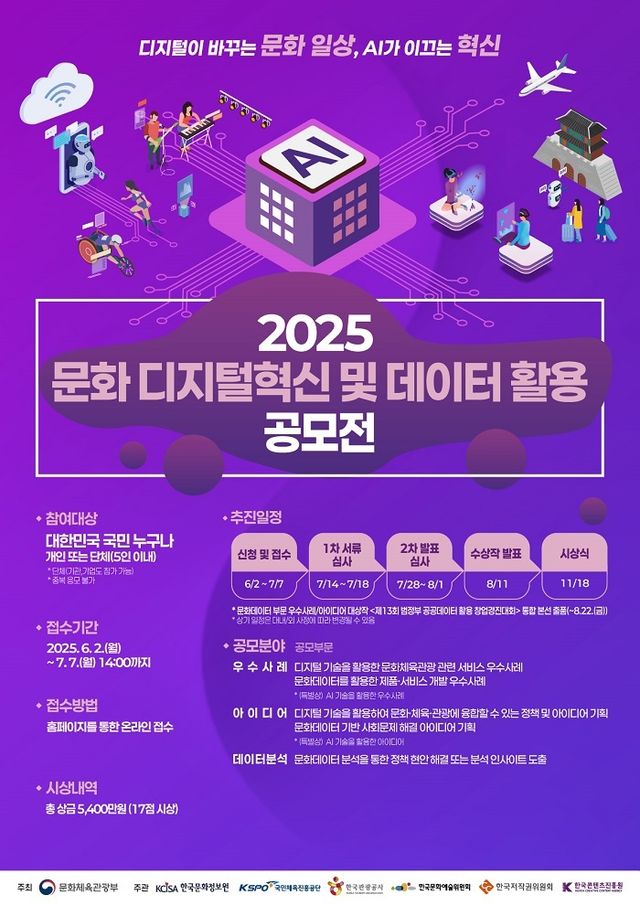 문화체육관광부(장관 유인촌, 이하 문체부)가 주최하고 한국문화정보원(원장 정운현, 이하 문정원)이 총괄 주관하는 2025 문화 디지털혁신 및 데이터 활용 공모전이 접수를 시작했다.