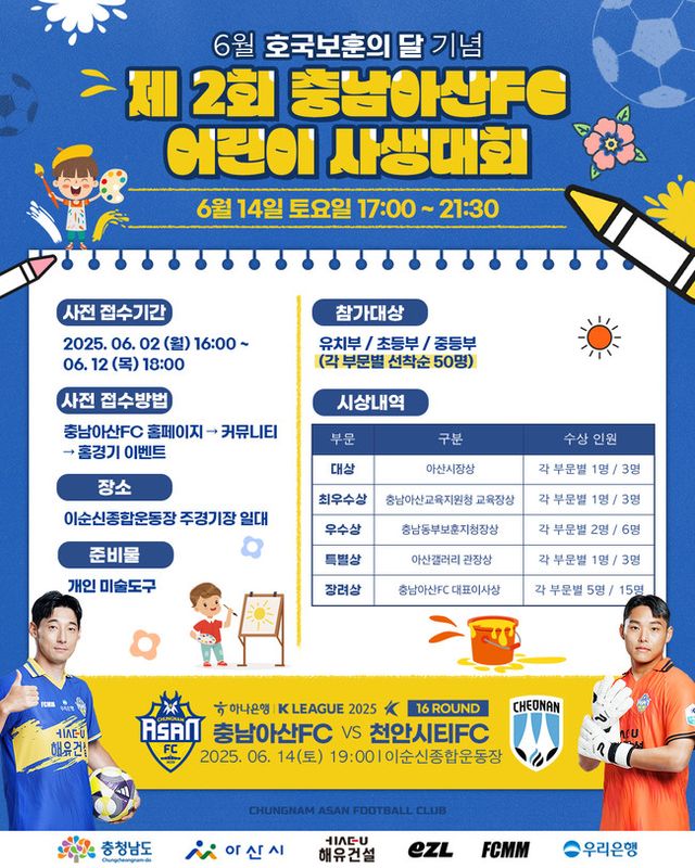 이번 사생대회는 유치부, 초등부, 중등부를 대상으로 진행되며, 각 부문별 50명씩 총 150명을 선착순 모집한다. 참가 신청은 6월 2일(월)부터 12일(목) 오후 6시까지, 충남아산FC 공식 홈페이지에서 가능하다.