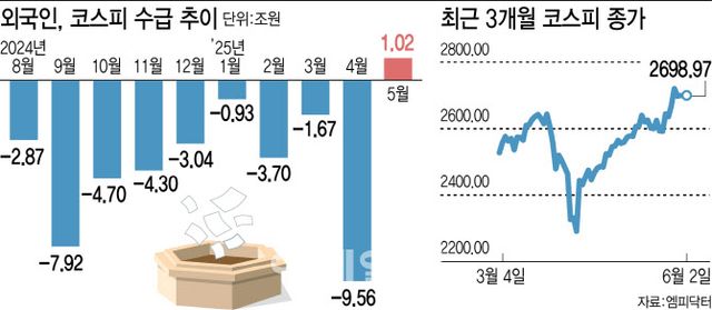 노동길 신한투자증권 연구원은 “코스피는 2600선 위에서는 외국인 유입이 필요하다”며 “외국인은 1개월간 액티브 성격으로 국내 주식을 순매수했다”고 말했다. 이어 “관세 부과 매크로 영향은 지연되고 협상 기대가 높아져 있어 6월 큰 변동성은 피해 갈 전망”이라며 6월 코스피 등락 범위를 2550포인트에서 2780포인트로 제시했다.