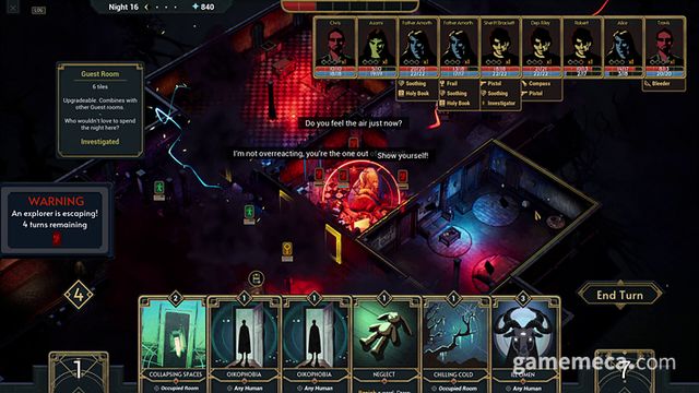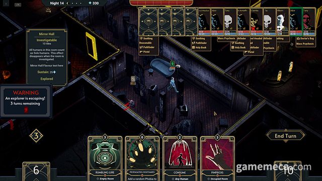 집에 찾아오는 인간들도 쉽게 당해주지는 않습니다. 일부 인간도 '특성'을 보유했는데요, 더 낮은 이성 피해를 받거나, 일정 턴이 지나면 동료를 부르는 식입니다. 같은 방에 여러 사람이 있으면, 한 인간이 사망하거나 기절하면 도주를 시도합니다. 이들이 탈출하면, 더 강한 사람이 출몰할 가능성이 높아집니다. 아울러 수확할 수 있는 정수도 줄어드는 만큼 최대한 도망치는 것을 막아 증거를 인멸하는 것이 좋습니다.