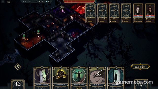 밤 동안 플레이어는 매 턴 카드 5장을 뽑고, 행동 포인트 3포인트 내에서 카드를 사용할 수 있습니다. 각 카드는 서로 다른 효과를 지녔습니다. '유령의 갈퀴'와 '집 공포증'은 각각 체력 피해와 이성 피해(소진)를 줍니다. 일부 카드에는 '특성'이 붙습니다. 예를 들어 '공간 붕괴'는 인간에게 체력 피해를 입힘과 동시에 공간을 잠시 봉쇄합니다. 방 안에 있는 인간뿐만 아니라 밖에서 방에 진입하려는 인원도 막는 만큼, 일직선 통로 중간에서 사용하면 턴을 벌 수 있습니다.