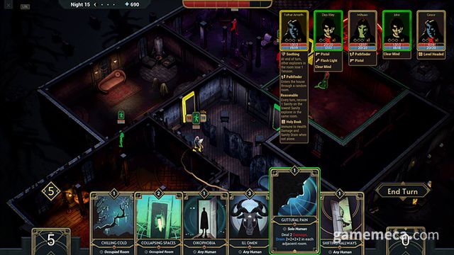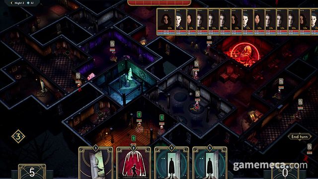 아무런 효과가 없는 일반 방부터 독특한 효과를 지닌 방까지 다양한 공간을 저택에 설치할 수 있습니다. 예를 들어 종탑에서는 마녀가 등장해 방에 있는 인간의 긴장도를 높입니다. 사람이 방을 통과하는 데 걸리는 턴은 방 크기와 무관합니다. 하지만 일반 방을 특수 방으로 업그레이드하기 위해서는 크기 조건을 충족해야 하죠. 작은 방을 여럿 설치해 꼬인 미로 같은 저택을 만들 수도, 여러 특수 방을 만들어 침입자를 방해할 수도 있습니다.