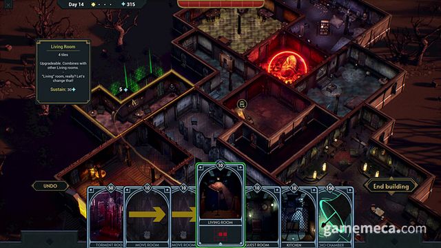 밤이 끝나면 덱에 영구적으로 추가할 사용 카드나 건물 건설 카드를 획득한 뒤, 낮이 옵니다. 낮에는 방을 건설하고, 건물 배치를 바꾸고, 방을 업그레이드하고, 함정을 설치하며 다음 밤을 설계할 수 있죠. 건물 설치와 업그레이드에는 인간을 처리해 획득한 '정수'가 소모됩니다. 심장에서 먼 방을 건설하기 위해서는 더 높은 비용을 지불해야 합니다.