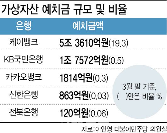 3월 말 기준으로 가상자산 이용자 예치금이 가장 많은 곳은 업계 1위 업비트와 제휴를 맺고 있는 케이뱅크로 약 5조 3610억원이다. KB국민은행은 케이뱅크에 이어 두 번째로 많았으나, 케이뱅크의 3분의 1 수준이다. 카카오뱅크(1814억원)·신한은행(863억원)·전북은행(120억원)이 뒤를 이었다. 현재 카뱅은 코인원, 신한은행은 코빗, 전북은행은 고팍스와 제휴 중이다. 케이뱅크는 전체 원화 예치금에서 가상자산 예치금이 차지하는 비중이 지난해 12월 말 28.2%(8조 510억원)에서 올해 1월 26.7%(7조 7562억원), 2월 22.8%(6조 2977억원), 3월 19.3%(5조 3610억원)로 점차 하락하고 있다. 이런 감소세는 비트코인이 10만 달러를 돌파한 후 횡보하는 등 가상자산 시세와 연관이 큰 것으로 풀이된다. KB국민은행의 가상자산 예치금 비중은 3월 말 기준 전체의 0.5% 정도다. 카카오뱅크는 0.3%였으며 신한은행과 전북은행은 각각 0.03%, 0.06%다.