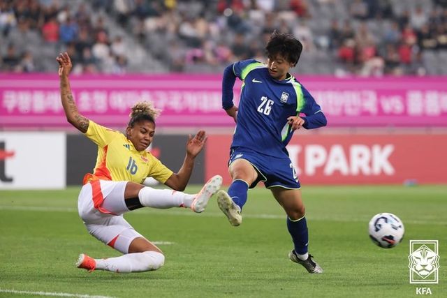 신상우 감독이 이끄는 대한민국 여자 축구 국가대표팀은 2일 오후 7시 용인미르스타디움에서 열린 ‘쿠팡플레이 초청 여자축구국가대표팀 친선경기’ 2차전에서 콜롬비아와 맞대결을 펼치고 있다. 전반전은 한국의 1-0 리드로 종료됐다.