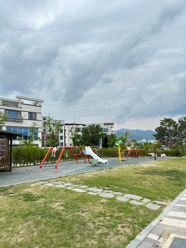 음악 놀이를 즐긴 후에는 야외 놀이터에서 자연을 배경으로 미끄럼틀 및 시소를 이용하여 신나는 시간을 보낼 수 있습니다. 이곳은 산과 강이 어우러진 경치 덕분에 더욱 특별한 경험을 제공합니다.