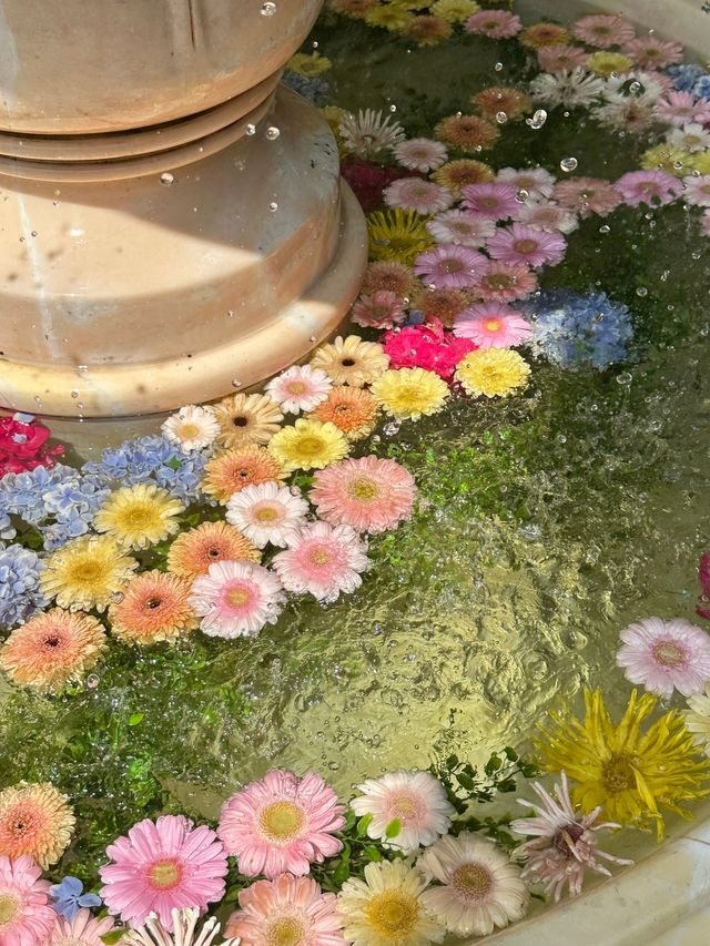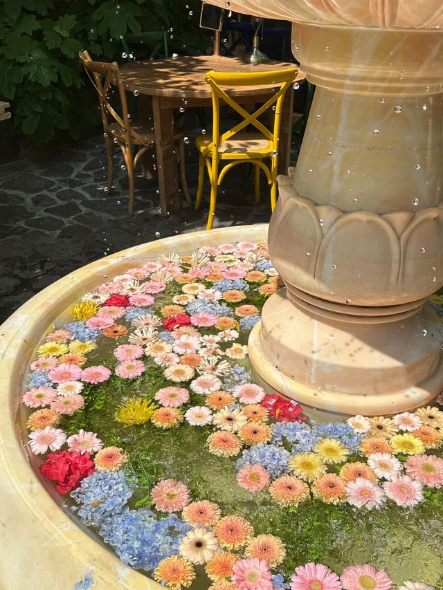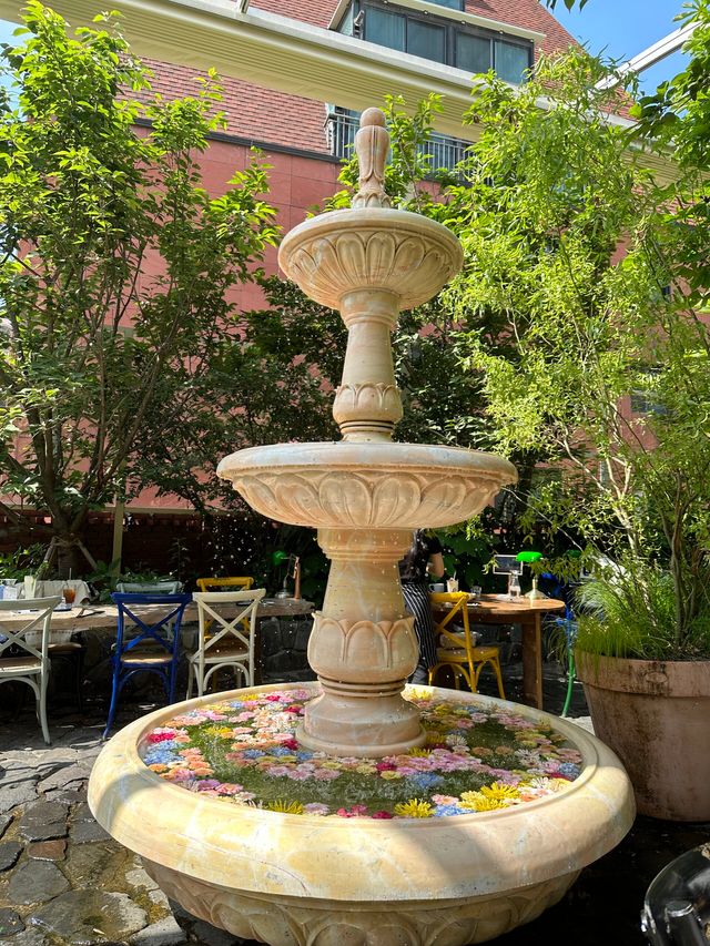 – 카페 내부에 들어서면 꽃으로 장식된 분수대가 먼저 시선을 사로잡습니다. 유럽 스타일의 분수대 위에 띄워진 다채로운 꽃들이 조화를 이루며 사진을 찍기에 좋고, 실제로도 감각적인 분위기를 제공합니다.