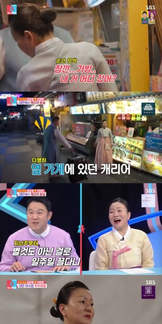 하지만 김미령의 캐리어는 바로 옆 가게에 있었고, 남편이 바로 가지고 왔다. 이 모습에 김구라는 "별 것도 아닌 것 가지고 1주일을 끌었다"면서 분노(?)해 웃음을 줬다.