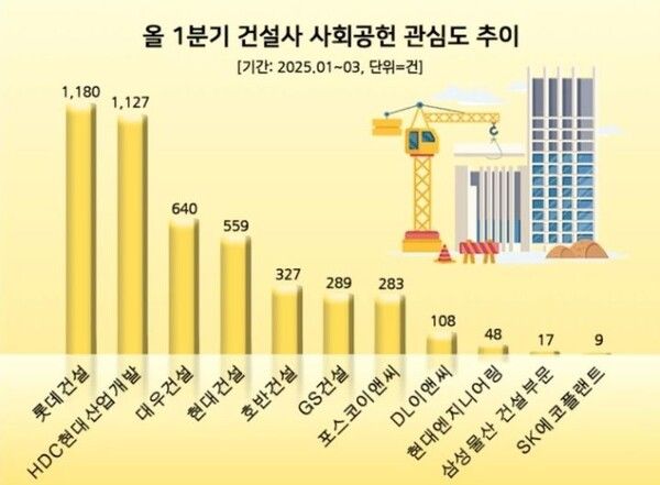뉴시스 보도에 따르면, 데이터앤리서치는 뉴스·블로그·커뮤니티·SNS 등 12개 온라인 채널에서 수집한 24만 개 사이트의 데이터를 기반으로 국내 주요 건설사의 1분기 사회공헌 활동 관련 정보량을 분석한 결과, 롯데건설이 총 1180건으로 가장 많은 포스팅 수를 기록하며 관심도 1위에 올랐다고 밝혔다.