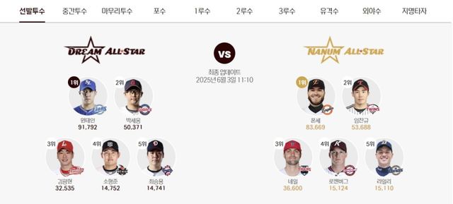 최종 '베스트12'는 팬 투표(70%)와 선수단 투표(30%)를 합산해 오는 23일 최종 발표된다. 최근 3년 동안 나눔 올스타 베스트12(선발투수 부문)에는 KIA 양현종(2022~2023년) 한화 류현진(2024)이 뽑혔다. 올해에는 임찬규가 홀로 토종 투수의 자존심을 짊어지고 있다.