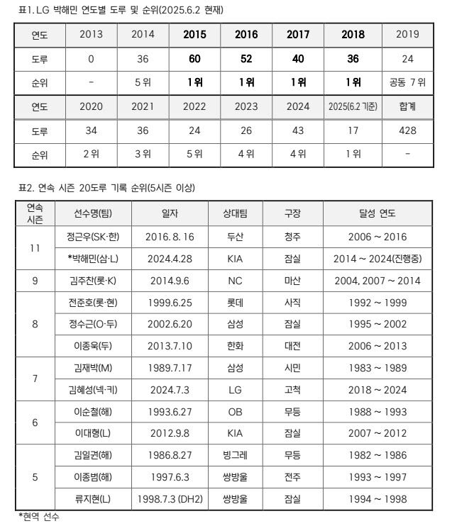 2013년 KBO 리그에 데뷔해 13번째 시즌을 맞이하고 있는 박해민은 3일 현재 17도루를 기록 중이다. 앞으로 도루 3개만 추가하면 정근우가 2016시즌 한화이글스 소속으로 달성한 11시즌 연속 20도루(2006~2016)를 넘어 역대 최초 12시즌 연속 20도루를 달성한다.