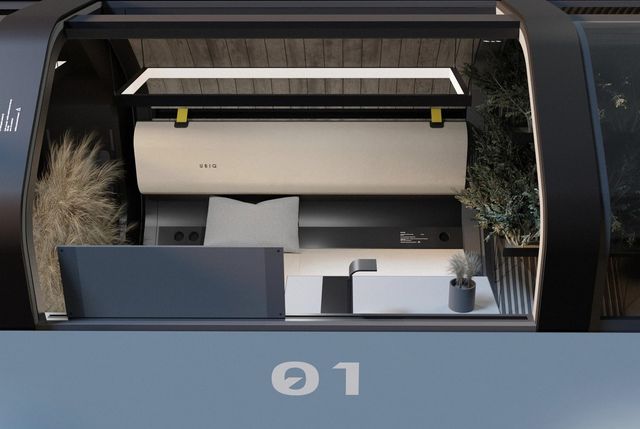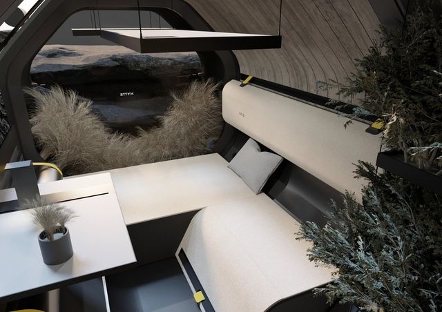 실내는 북유럽식 전원주택에서 영감을 받은 미니멀한 구성이다. 침대와 책상은 나란히 배치했고, 좌석은 수납 기능을 겸한다. 공간 활용에 초점을 맞춘 설계로 1인용 사용을 전제로 한 것으로 보인다.