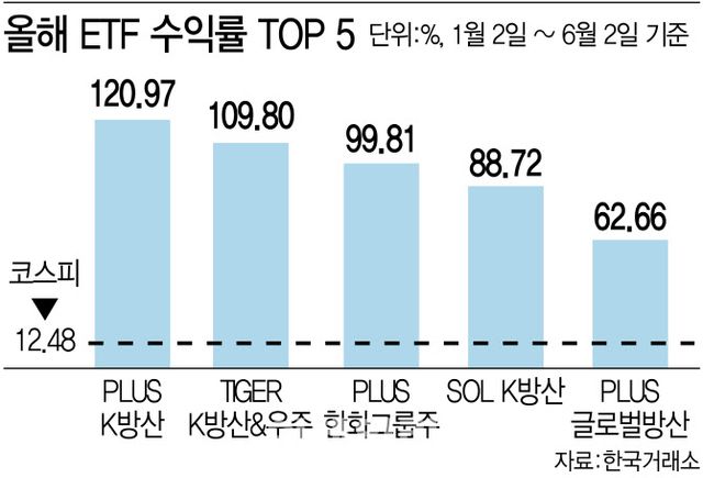 3일 한국거래소에 따르면 올해 전체 상장지수펀드(ETF) 중 가장 높은 수익률을 기록한 ETF는 ‘PLUS K방산’ ETF로 120% 올랐다. 2위는 ‘TIGER K방산 & 우주’로 109% 상승했다. 3위는 ‘PLUS 한화그룹주’로 99% 상승했고, ‘SOL K방산’과 ‘PLUS 글로벌 방산’이 각각 88%, 62% 오르며 4, 5위를 차지한 것으로 나타났다. 수익률 상위권을 방산 관련주가 휩쓴 셈이다.