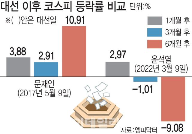 3일 엠피닥터 등에 따르면 2010년대 이후 치러진 세 차례의 대선 직후 유가증권시장(코스피) 지수는 대체로 오름세를 나타냈다. 2017년 5월 대선 이후 한 달간 코스피 지수는 3.88% 상승했고, 2022년 3월 대선 때도 같은 기간 2.97% 올랐다. 다만, 2012년 12월 대선 이후엔 한 달 동안 코스피 지수가 0.26% 하락해 예외적인 흐름을 보였다.